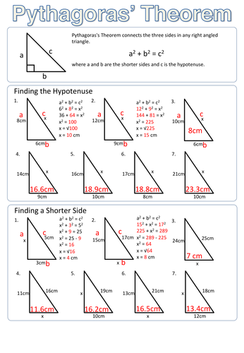 Free Pythagorean Theorem Worksheets PrintableRudolph ... These free Pythagorean Theorem worksheets are downloadable, printable, and come with corresponding printable answer pages. In mathematics, the Pythagorean theorem is a relation in Euclidean geometry among the three sides of a right triangle. It states that the square of the hypotenuse (the side opposite the right angle) is equal to the sum of the squares of the other two sides.